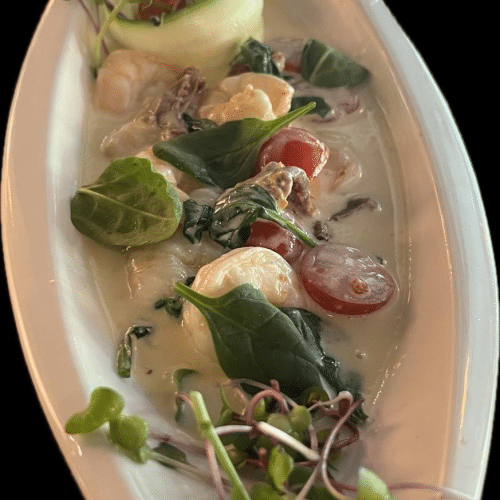 400 gram duszonych muli w pikantnym sosie pomidorowym ze świeżą kolendrą i grzankami