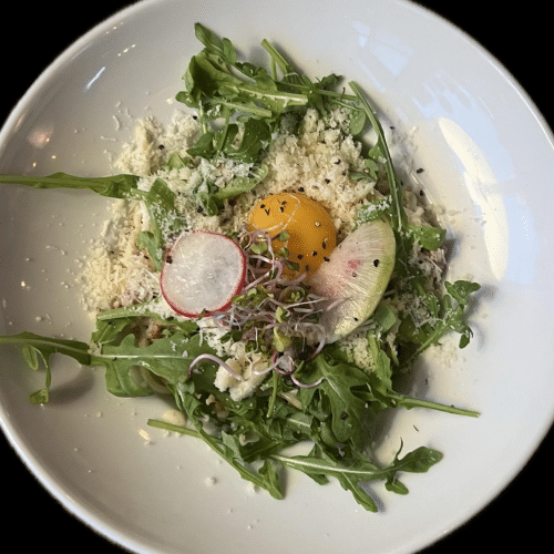 chrupiąca pancetta w sosie parmezanowo-śmietanowym z surowym żółtkiem jaja kurzego i czarnym czosnkiem wędzonym